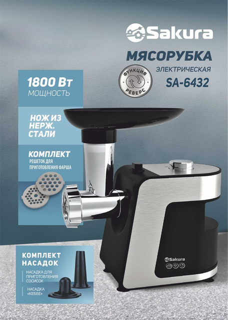 62292 | Мясорубка SAKURA SA-6432, 1800Вт, реверс + компл нас /1/6/ | 4571,94 | |||||