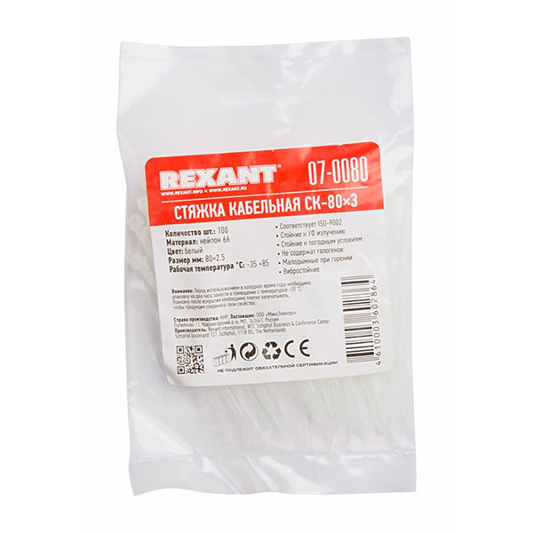 Хомут nylon 80 x 2,5 мм 100 шт белый REXANT /1/10/500/ 07-0080