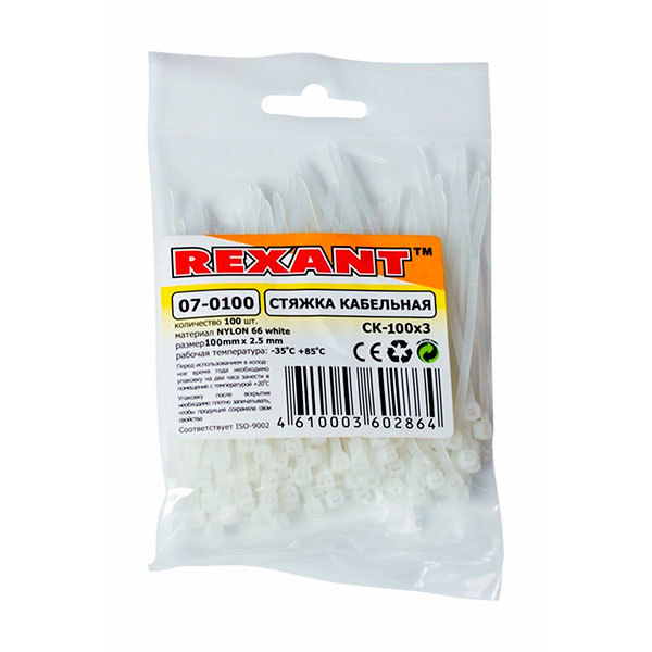 Хомут nylon 100 x 2,5 мм 100 шт белый REXANT /1/10/300/ 07-0100