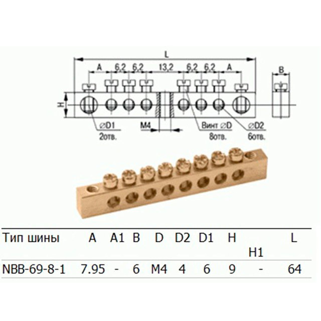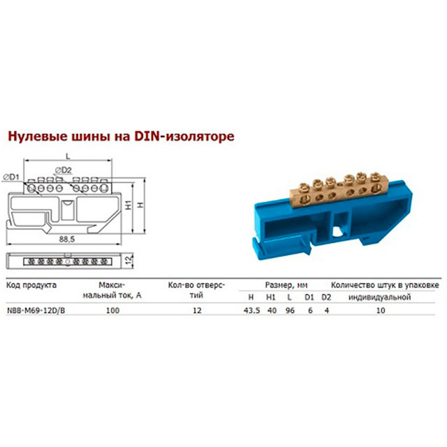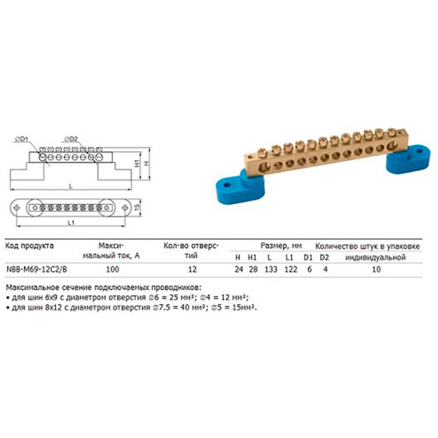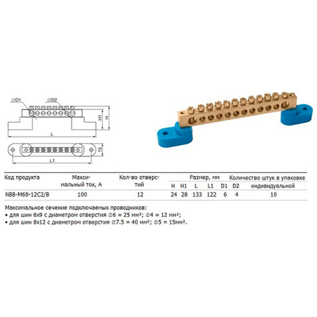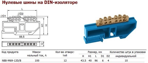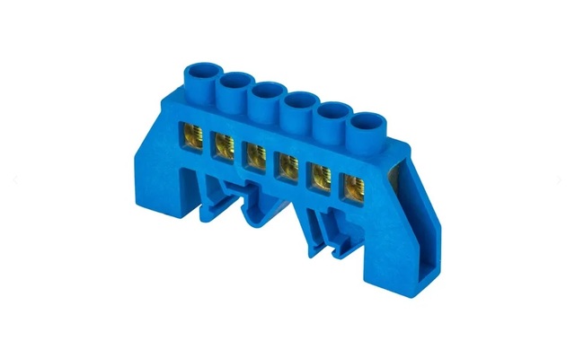 Шина EKF PROxima "0" N (8х12мм), 6 отверстий, латунь, синий нейлоновый корпус комбинированный /1/20/