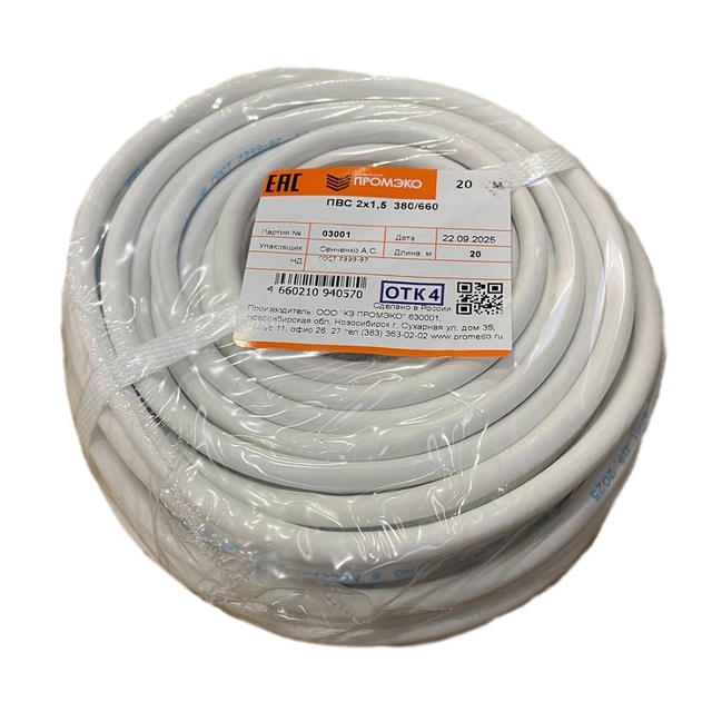 Провод ПВС 2х1,5 ГОСТ 7399-97 (бухта 20м) /1/