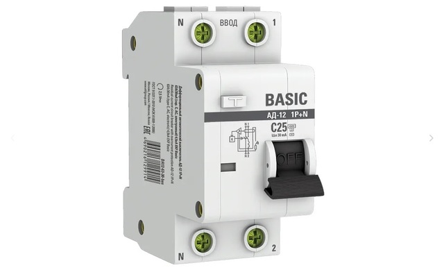 Автомат дифференциальный 1P+N 25А 30мА тип АС х-ка C эл. 4,5кА АД-12, EKF Basic /1/6/