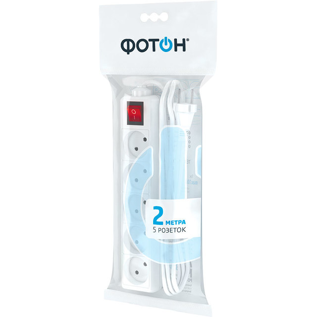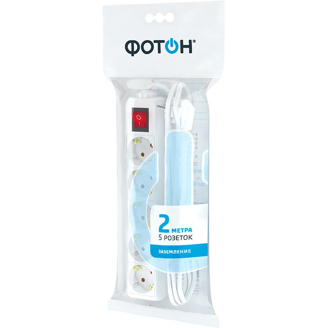 Удлинитель сетевой "ФОТОН" 10-25S (1х5) Для дома 2м, 10А, с выкл., белый /1/20/