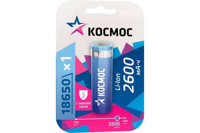 Космос 18650 Li-ion2600 mAh с защитой, 1BL /1/10/100/