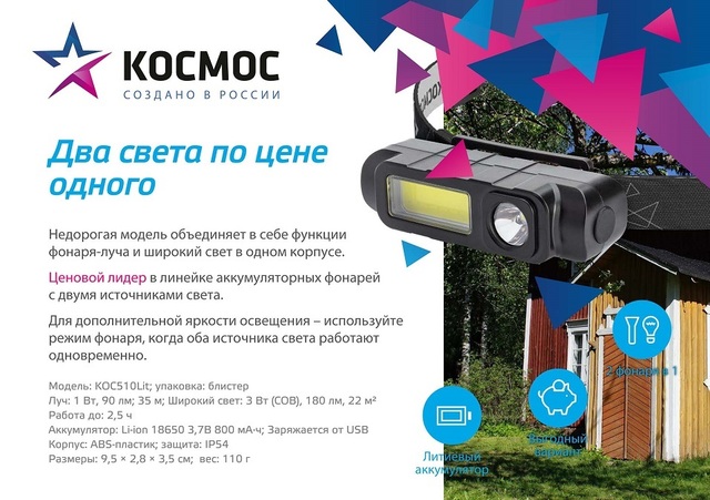 КОСМОС KOC508Lit, аккумуляторный, 3Вт+3ВтCOB, кол. линза, Li-ion18650 1200mAh, ABS-пластик, IP54, US