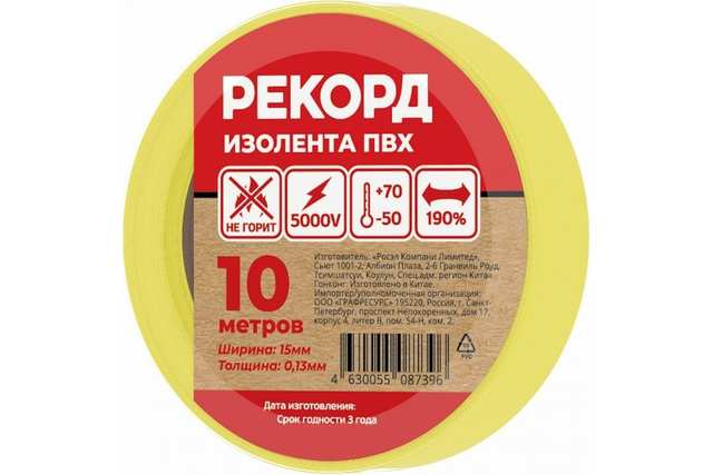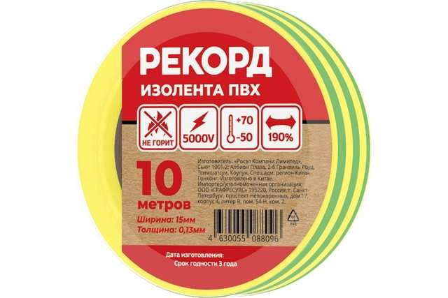 Изолента РЕКОРД 15мм х 10м х 0,13мм, желто-зеленый /10/250/
