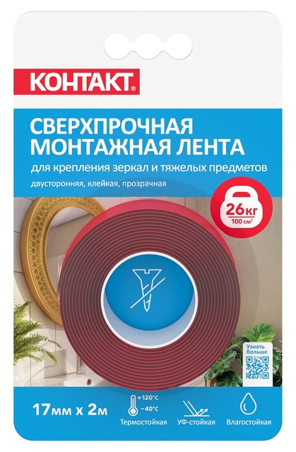 Клейкая лента монтажная двусторонняя, 17мм х 2м, сверхпрочная, прозрачная, "КОНТАКТ" /1/12/144/