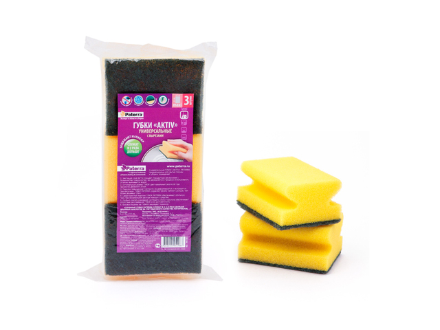Губка бытовая с поверхностью AKTIV, PATERRA, профильные,3 шт. в уп., 65*85*44 мм (maxi) /1/38/ /406-