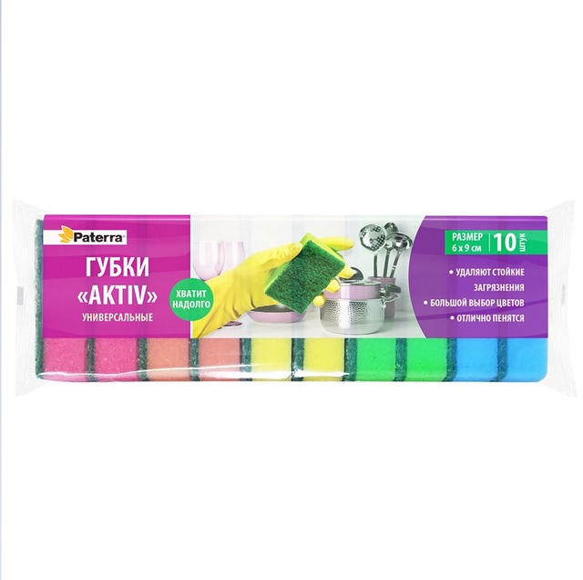 Губка бытовая с поверхностью AKTIV, PATERRA 10шт. в уп, 60х90мм, /1/34/ 406-037