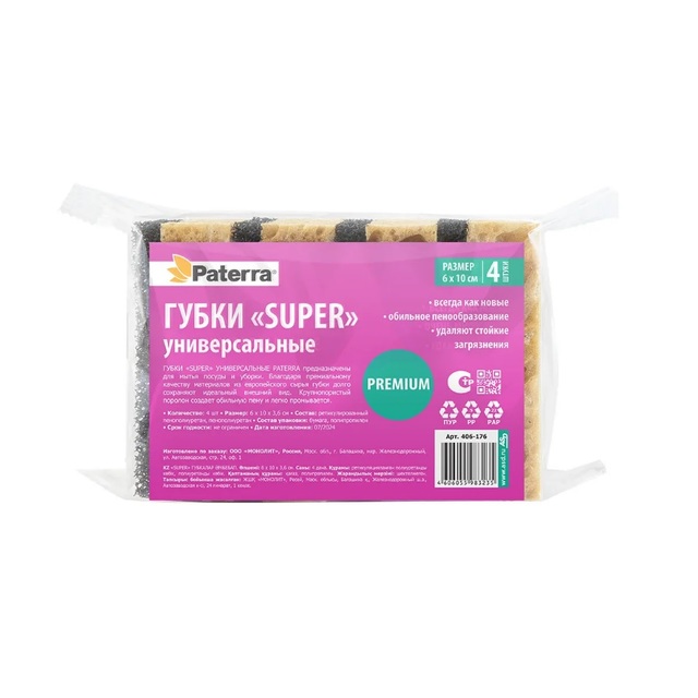Губка универсальная «SUPER», с ретикулированным пенополиуретаном, (уп. 4шт), PATERRA /1/24/ 406-176