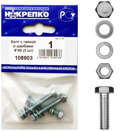 Болт с гайкой и шайбами 6*40 (3 шт) 108903 /1/25/