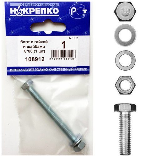 Болт с гайкой и шайбами 8*80 (1 шт) 108912 /1/25/
