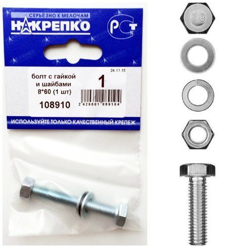 Болт с гайкой и шайбами 8*60 (1 шт) 108910 /1/25/