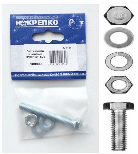 Болт с гайкой и шайбами 8*50 (1 шт) 108909 /1/25/