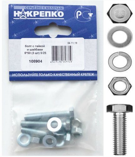 Болт с гайкой и шайбами 6*50 (3 шт) 108904 /1/25/