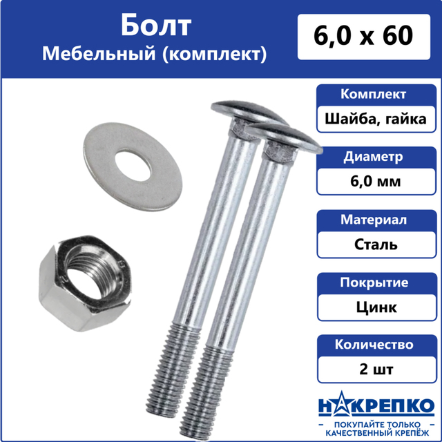 Болт мебельный с гайкой и шайбой 6*60 "НАКРЕПКО" (2 шт) /5/25/ 109305