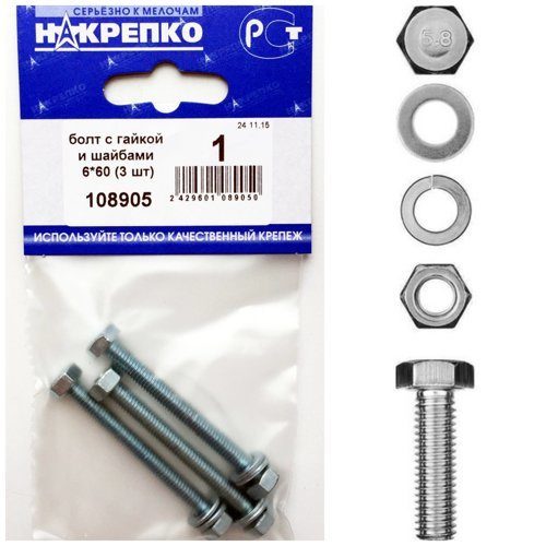 Болт с гайкой и шайбами 6*60 "НАКРЕПКО" (3 шт) /1/25/ 108905