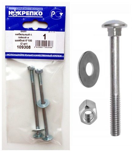 Болт мебельный с гайкой и шайбой 6*100 "НАКРЕПКО" (2 шт) /1/5/25/ 109308