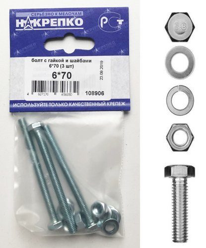 Болт с гайкой и шайбами 6*70 "НАКРЕПКО" (3 шт) /1/5/25/ 108906