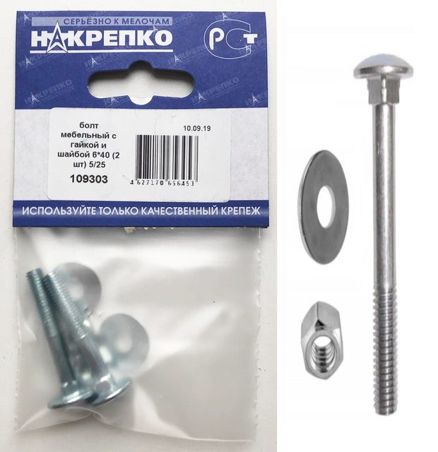 Болт мебельный с гайкой и шайбой 6*40 "НАКРЕПКО" (2 шт) /5/25/ 109303
