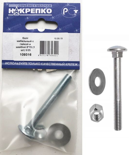 Болт мебельный с гайкой и шайбой 8*70 "НАКРЕПКО" (1 шт) /5/25/ 109316