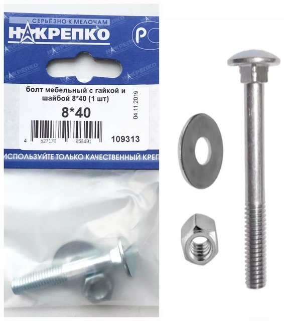 Болт мебельный с гайкой и шайбой 8*40 "НАКРЕПКО" 109313 (1 шт) /5/25/