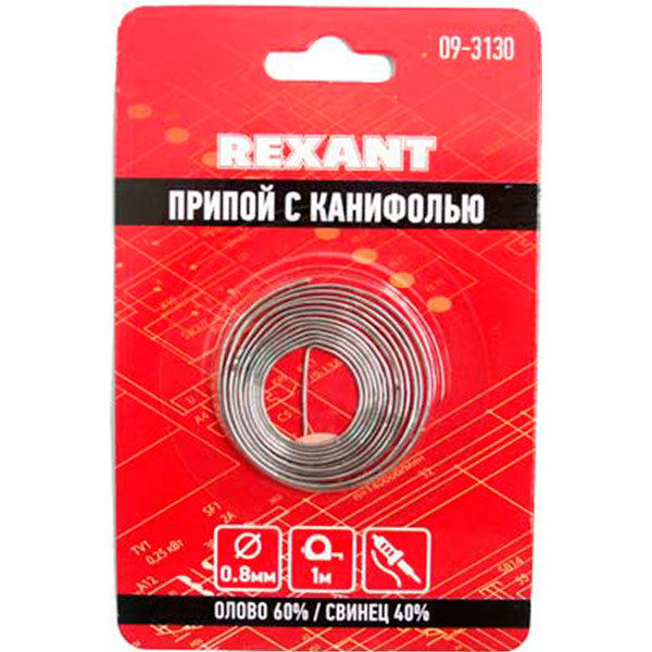 Припой с канифолью d-0.8мм Спираль 1 метр (Sn60 Pb40 Flux 2.2%) блистер REXANT /1/50/400/ 09-3130