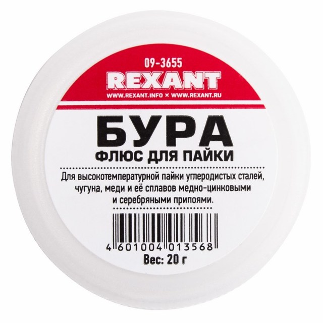 Флюс для пайки БУРА 20гр (для углеродистых сталей, чугуна, меди и её сплавов, ювелирных укр) REXAN