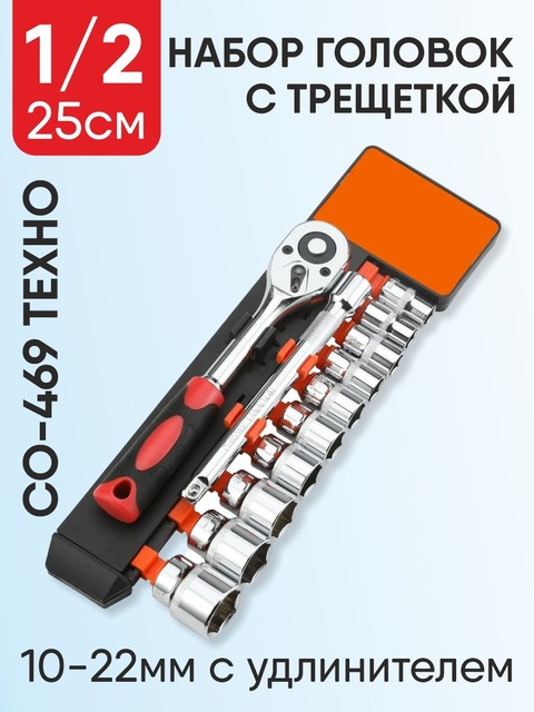 Набор Головок с трещоткой 25 см 10" 1/2, 10-22 мм с удлинителем СО-469 ТЕХНО /1/5/20/