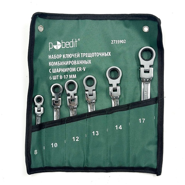 Набор ключей трещоточных комбинированных с шарниром Cr-V, 6шт, 8-17мм, Pobedit /1/10/ 2735902