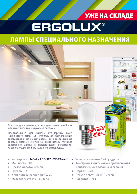 Ergolux LED-T26-3W-E14-4К (Эл.лампа светодиодная Т26 3Вт Е14 4500К 220-240В) для холодильников, швей