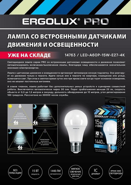 Ergolux LED-A60P-15W-E27-4K PRO ЛОН 15Вт Е27 4500К 220-240В с датчиками /1/10/100/ 14763