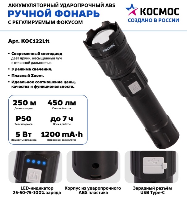 КОСМОС KOC122Lit аккумуляторный, 5Вт P50 LED, ZOOM, Li-ion 1200mAh, ABS /1/8/