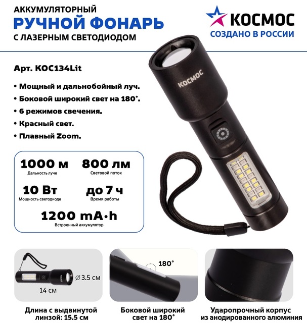 КОСМОС KOC134Lit, аккумуляторный, 10ВтLaserLED, широк. cвет, Li-ion 1200mAh, алюм. /1/5/