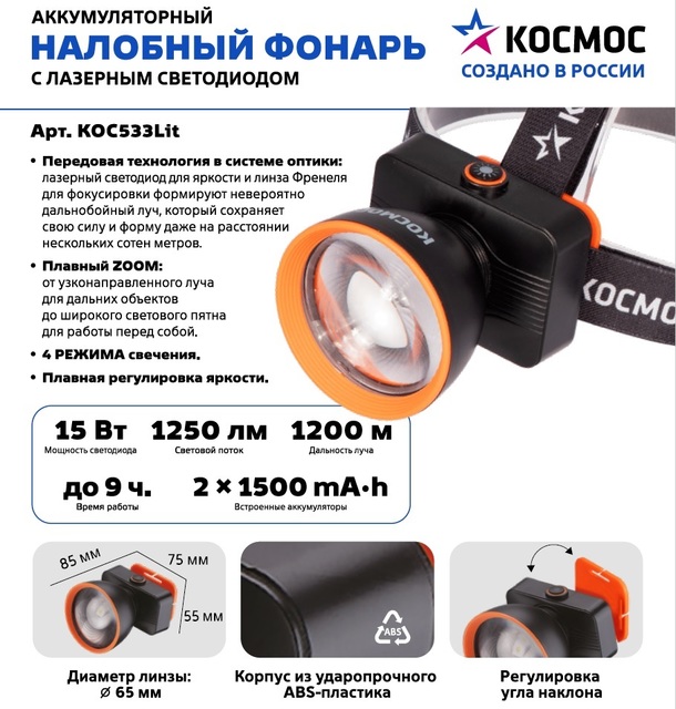КОСМОС KOC533Lit, аккумуляторный, 15Вт Laser LED, 3000mAh, ABS пластик, линза Френеля /1/12/