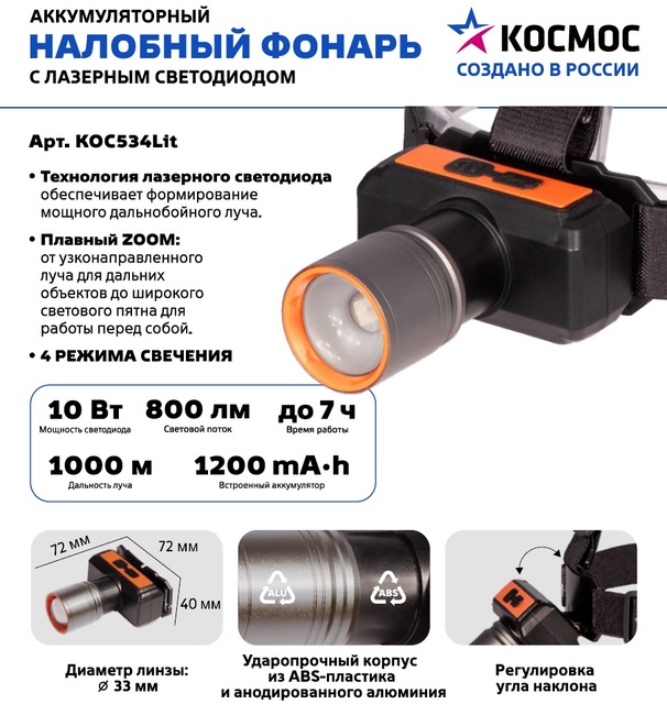 КОСМОС KOC534Lit, аккумуляторный, 10Вт Laser LED, 1200mAh, ABS пластик + алюминий /1/20/