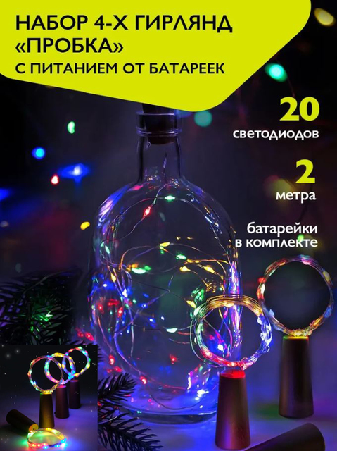 Гирлянды DC-G04-20MS4, комплект 4 шт., Пробки, мульт., 20 LED, 3xAG13, ФАZA /1/60/