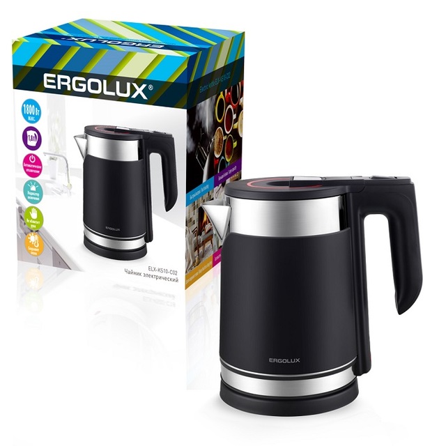Чайник ERGOLUX ELX-KS10-C02, 1.8л, 1800Вт, 220-240В, нерж. сталь/пластик, черный /1/12/ 15328
