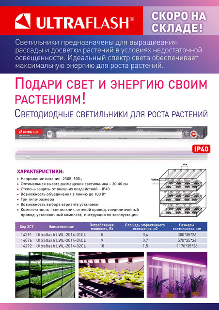 Светильник для растений Ultraflash LWL-2014-03CL ФИТО св-к, 15 Вт размер 900*26*35мм/1/25/